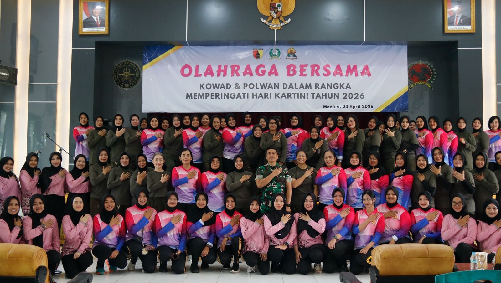 Madiun – Dalam rangka memperingati Hari Kartini, Kowad dan Polwan di Madiun menggelar olahraga bersama di Markas Yonif Para Raider 501/Bajra Yudha, Kota Madiun, Kamis (23/4/2026). Kegiatan diawali dengan senam bersama dan dilanjutkan dengan olahraga umum.