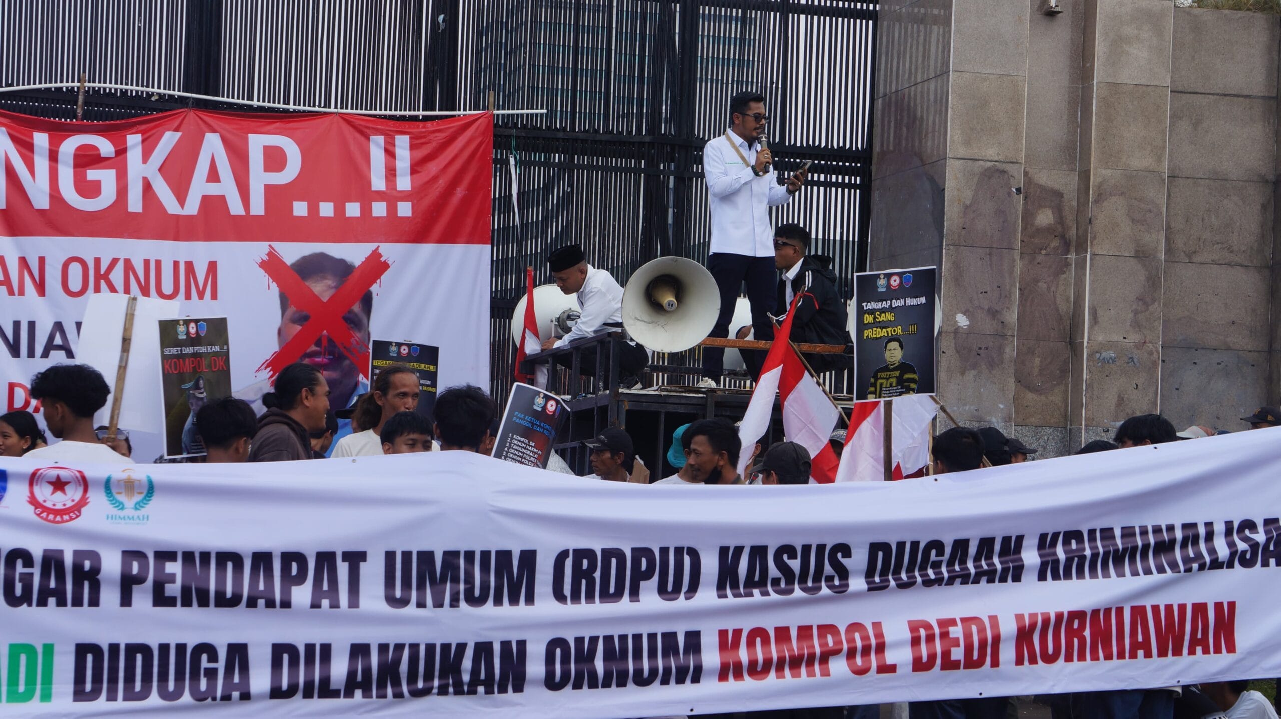 Terlihat massa membawa berbagai atribut unjuk rasa berupa baliho dan spanduk besar yang memuat tuntutan: “Tangkap, Periksa, dan PTDH-kan Oknum Kompol Dedi Kurniawan Diduga Pelaku Kriminalisasi dan Rekayasa Hukum Kasus Rahmadi”.