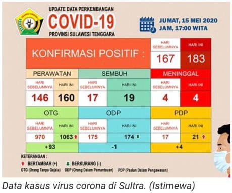 “Hari ini ada penambahan kasus pasien yang positif Corona yaitu 15 warga Buton Tengah dan 1 warga Bombana,dengan penambahan ini,maka total keseluruhan yang positif di Sultra berjumlah 183 orang,” kata Rabiul.