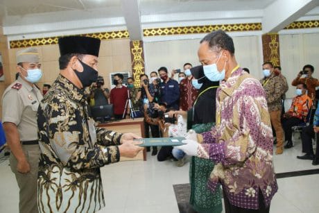 Lampung Utara, Nusantara Pos – Plt. Bupati Lampung Utara (Lampura)  Budi Utomo menghadiri acara penyerahan Sertipikat Tanah untuk rakyat secara virtual di Aula Tapis kantor Pemda setempat, Jumat (3/7/2020).