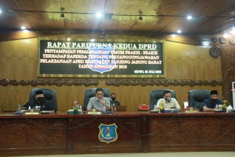 Tanjab Barat, Nusantarapos.co.id – Bupati Safrial menghadiri rapat paripurna ke-dua yang mengagendakan penyampaian pandangan umum Fraksi – Fraksi Dewan Perwakilan Rakyat Daerah Kabupaten (DPRD) Tanjung Jabung Barat atas Raperda tentang pertanggungjawaban Pelaksanaan APBD Tahun Anggaran 2019 yang disampaikan Bupati Tanjung Jabung Barat pada Rapat Paripurna pertama beberapa waktu lalu. Senin (20/7/2020).