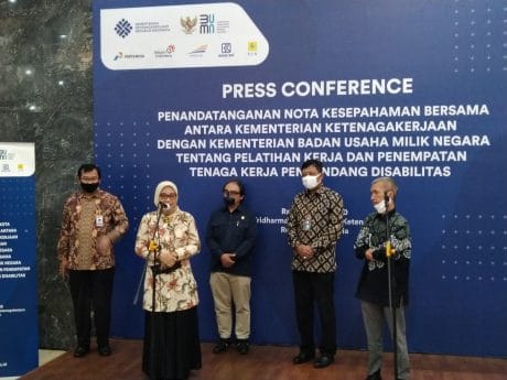 Jakarta, Nusantarapos – Dalam upaya memberikan pelindungan dan pemenuhan hak kepada penyandang disabilitas, Kementerian Ketenagakerjaan menandatangani Nota Kesepahaman bersama dengan Kementerian Badan Usaha Milik Negara (BUMN) tentang pelatihan kerja dan penempatan tenaga kerja penyandang disabilitas pada BUMN.