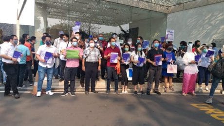 Disini kami para wartawan mencoba bertanya kepada petugas keamaan gedung dan mereka menjawab terkuncinya pintu di lantai Lobby karena salah satu protokol keamaan untuk Covid-19 dan jika ada terjadi demo aksi semacam ini juga kami tidak tahu karena kami hanya menjalankan tugas kami sebagai keamaan gedung saja.