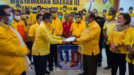 Wasekjen DPP Partai Golkar Derek Laupatty sedang menyerahkan surat mandat penundaan musda kepada Lambert Jitmau yang merupakan calon Ketua DPD I Golkar Papua Barat dan juga walikota Sorong.