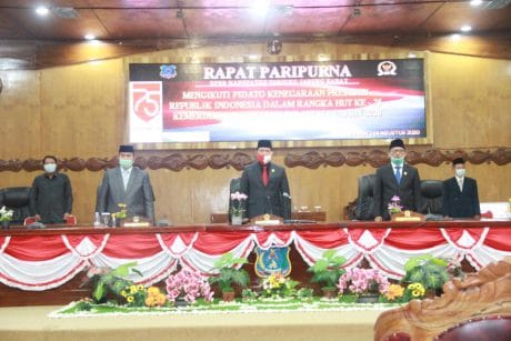Tanjab Barat, Nusantarapos – Wakil Bupati Tanjung Jabung Barat Drs. H. Amir Sakib hadiri Rapat Paripurna DPRD mendengarkan Pidato kenegaraan Presiden Republik Indonesia Joko Widodo yang ditayangkan langsung lewat siaran TV Nasional dalam rangka Peringatan Hari Ulang Tahun Republik Indonesia Tahun 2020, Jumat (14/08).