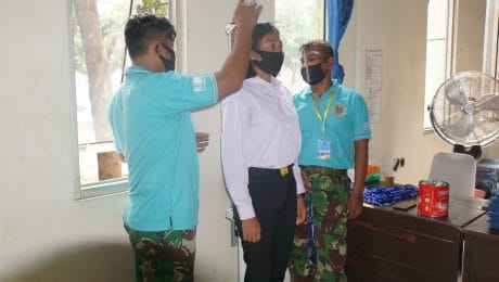 Pelaksanaan pendaftaran/validasi calon Bintara dan Tamtama PK TNI AL Gelombang II Tahun 2020 di Panda Lantamal III Jakarta, dengan menerapkan protocol kesehatan di masa pemberlakuan PSBBT (Pembatasan sosial berskala besar masa teransisi) sebagai upaya pencegahan dari penularan covid-19, seperti cuci tangan, pengukuran suhu tubuh, memakai masker, dan physical distancing, begitu pula para petugas panitia Lantamal III terlihat menggunakan pelindung muka/face shield.