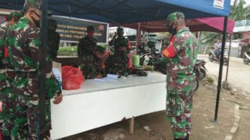 POLMAN, NUSANTARAPOS – Komando Tugas Gabungan Terpadu (Kogasgabpad) Kodim 1402/Polmas mendirikan poskotis kogasgabpad protokol kesehatan di sejumlah tempat keramaian di Kabupaten Polewali Mandar.