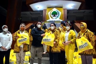 Anggota Ikatan Istri Partai Golkar (IIPG), memberikan secara simbolis bantuan sosial berupa sembako kepada awak media di Kantor DPP Partai Golkar, Jakarta Barat, Jumat (15/1/2020). IIPG menyalurkan ratusan bansos kepada awak media yang terdampak Pandemi Covid-19 melalui program Jumat Berbagi.