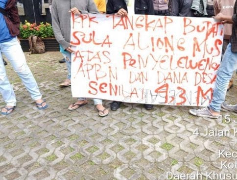 Dengan membawa spanduk serta Bendera Merah Putih dan spanduk yang bertuliskan Tangkap Bupati Sila Aiong Mus atas penyelenggara APBN dan Dana Desa senilai 4,3 M ini berorasi di depan kantor KPK.