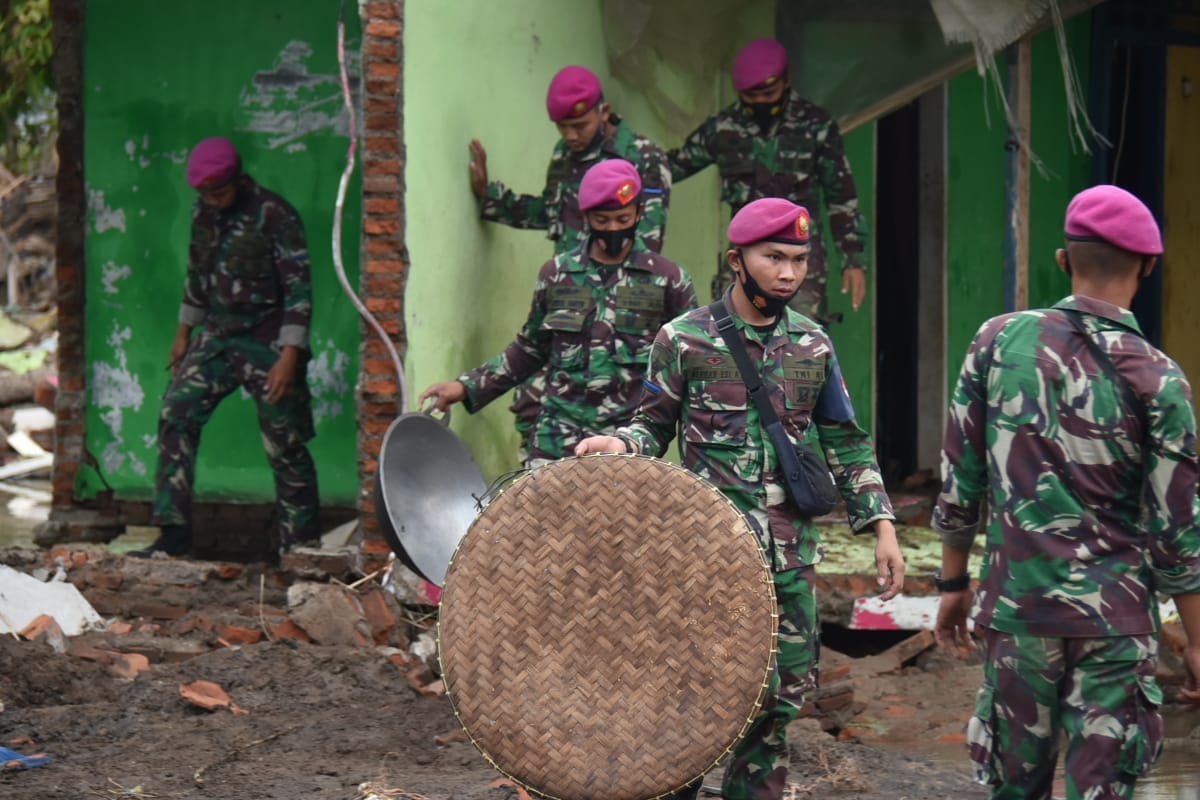 Satu Tim Marinir dengan kekuatan 10 orang dipimpin oleh Letda Marinir Josias dibantu oleh warga setempat bahu membahu memindahkan harta benda diantaranya 20 karung gabah, peralatan rumah tangga dan barang yang masih layak pakai.