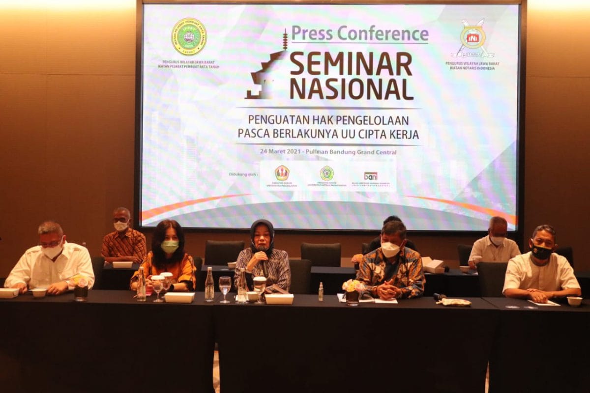Bandung, NUSANTARAPOS.CO.ID – Ikatan Notaris Indonesia (INI) dan Ikatan Pejabat Pembuat Akta Tanah (IPPAT) Pengurus Wilayah (Pengwil) Jawa Barat yang didukung oleh Fakultas Hukum Universitas Padjajaran (UNPAD) dan Universitas Parahyangan (UNPAR), mengadakan seminar nasional yang bertajuk “Penguatan Hak Pengelolaan Pasca Berlakunya Undang Undang Cipta Kerja” yang pada Rabu (24/03/2021) di Pullman Bandung Grand Central Hotel, Bandung-Jawa Barat.