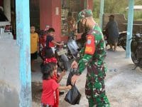 Seperti halnya yang dilakukan Serda Heijaz, Babinsa Koramil 07/Kapuas Barat yang setiap harinya selalu berjibaku dengan warga melaksanakan bagi rejeki berupa pembagian snack kepada anak-anak desa.