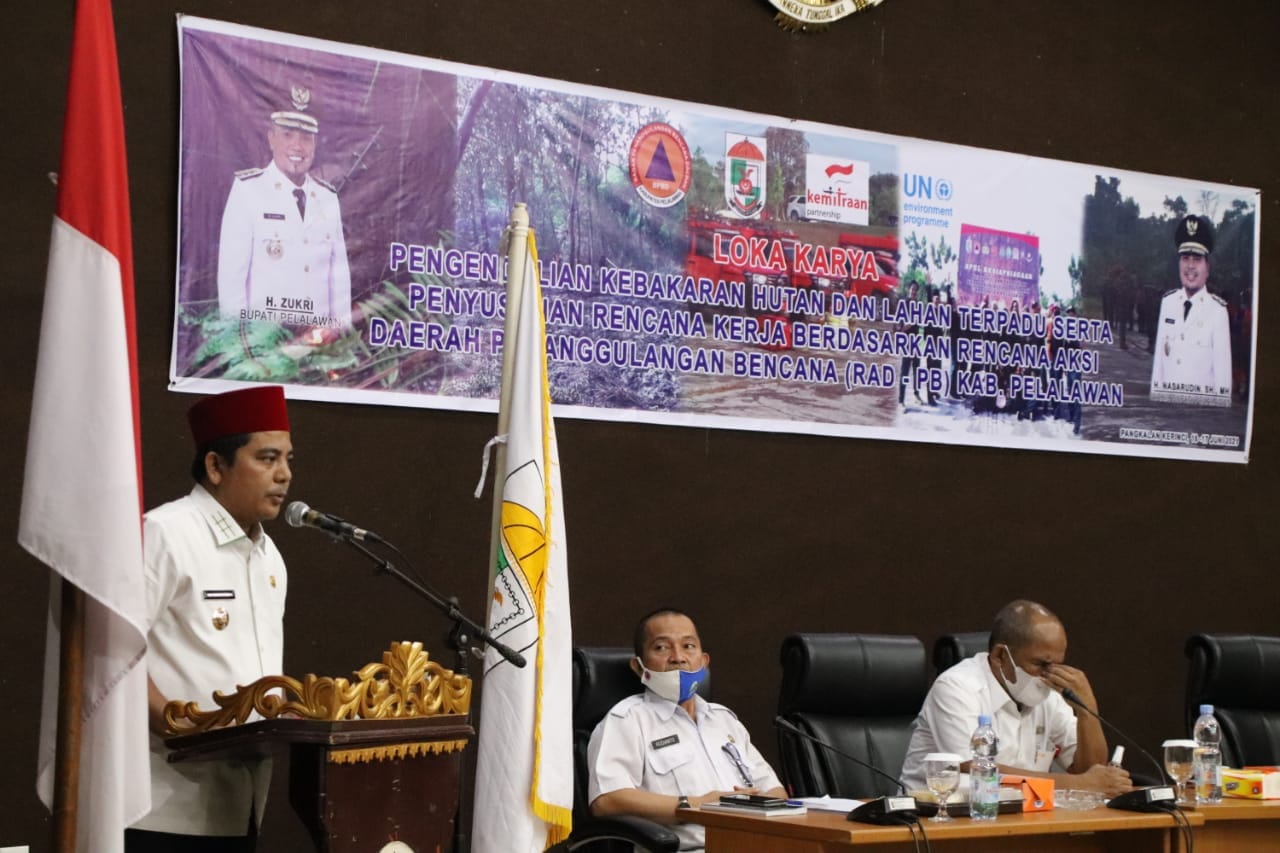 Pelalawan, Nusantarapos – Wakil Bupati Pelalawan H. Nasaruddin membuka acara Lokakarya Pengendalian Kebakaran Hutan dan Lahan Terpadu serta Penyusunan Rencana Kerja Berdasarkan Rencana Aksi Daerah Penganggulangan Bencana (RAD-PB) Kabupaten Pelalawan di auditorium kantor bupati Pelalawan pada Rabu, 16 Juni 2021.