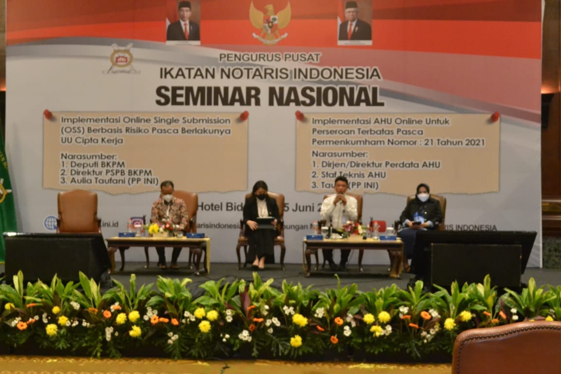 Terkait hal tersebut, dalam rangkaian acara memperingati Hari Ulang Tahun (HUT) ke-113 Ikatan Notaris Indonesia (INI) yang akan jatuh pada tanggal 1 Juli 2021, Pengurus Pusat Ikatan Notaris Indonesia (PP-INI) pada Selasa (15/6/2021) kemarin di Bhirawa Ballroom Hotel Bidakara, Jakarta, menyelenggarakan Seminar Nasional yang dilakukan secara Online dan Offline dengan tema “Implementasi Perizinan Berbasis Risiko Pasca Berlakunya UU Cipta Kerja” dan “Implementasi AHU Online untuk PT Pasca Berlakunya Permenkumham RI No. 21 Tahun 2021”.