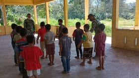 Hari kelima TMMD ke-111 Kodim 0212/TS Prada Hadanan Habibi dkk, di Aula Terbuka di Desa Siuhom, Kec.Angkola Barat, Tapes, melatih anak-anak PBB, Sabtu (19/6/2021), mengatakan latihan PBB hari ini dilaksnanakan di Aula agar aanak-anak tidak kepananasan.