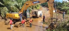 Tanah Laut-Anggota Satgas bersama warga setempat, melalui program TNI manunggal membangun desa (TMMD) ke 111, Satu Unit alat berat nampak membantu pemasangan Box Culvert di Dusun Riam Pinang Kec. Bajuin Kab. Tanah Laut. Jumat (25/06/21).