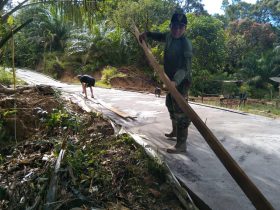 BENGKAYANG – Berkat kerja sama TNI dengan warga desa Sentangau Jaya Jalan Trans Segorong Kecamatan Seluas Kab Bengkayang, dalam pelaksanaan TMMD Ke-111 Kodim 1202/Singkawang membangun Jalan Rabat beton, tahap Membuka Papan mal Jalan. sudah kering sehingga papan yang digunakan untuk pengecoran mulai dibongkar.