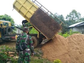 Bengkayang – Serka Indra anggota satgas TMMD ke-111. Kodim 1202/skw sedang mengawasi penurunan material pasir .