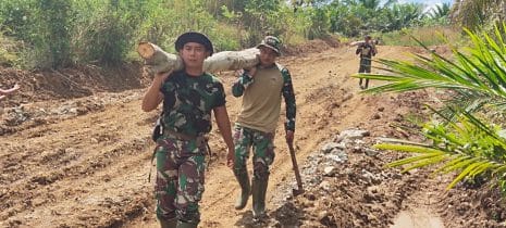Tanah Laut – Personel Yonif 623/Bhakti Wira Utama Kompi Senapan C yang tergabung dalam Satgas TMMD ke-111 Kodim 1009/Tanah Laut, bahu membahu memasang siring kayu penahan tanah uruk untuk Box Culvert. Dusun Riam Pinang Kel. Tanjung Kec. Bajuin Kab. Tanah Laut, Rabu (30/06/2021).
