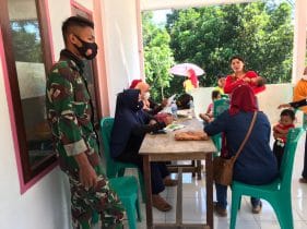 Anggota satgas TMMD Terlihat Mendampingi pelaksanaan kegiatan Posyandu untuk memberikan pelayanan kesehatan pada balita di Dusun Trimulya.