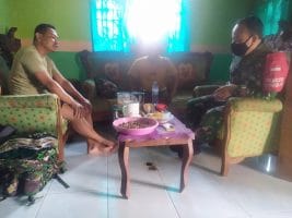 Gresik,- Usai melakukan pekerjaan disasaran fisik TMMD, Sertu Suwono anggota Satgas TMMD Reguler ke-111 Kodim Gresik tidak langsung pulang. Ia memanfaatkan sedikit waktu untuk sekedar menyambangi warga setempat. Kali ini Ia mampir di rumah Raji, di Dusun Bejan, Desa Siwalan, Rabu (30/6/2021).