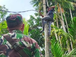 Salah satu personil Satgas TMMD Kodim 0817/Gresik Serda Heru Babinsa Ramil 0817/14 Panceng bersama Masyarakat sedang membantu petugas yang sedang melakukan pemasangan Instalasi listrik di tiang PJU.
