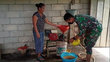 Anggota Satgas TMMD ke-111 Kodim 1202/Singkawang Serda Stefelik Hendry sedang membantu pembuatan tahu buk Suminah(37) Dusun Trimulya di Desa Sentangau Jaya.