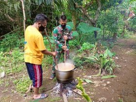 “Bapak-bapak yang tadi terus mengaduk gulai tersebut sesekali menjelaskan kepada Satgas yang dari tadi menemaninya untuk mengikuti irama adukannya. Sesekali dia menjelaskan cara memasak gulai yang baik dengan gunakan kayu bakar,” jelas Prada Ahmad Wahidin, Minggu (3/7/2021)
