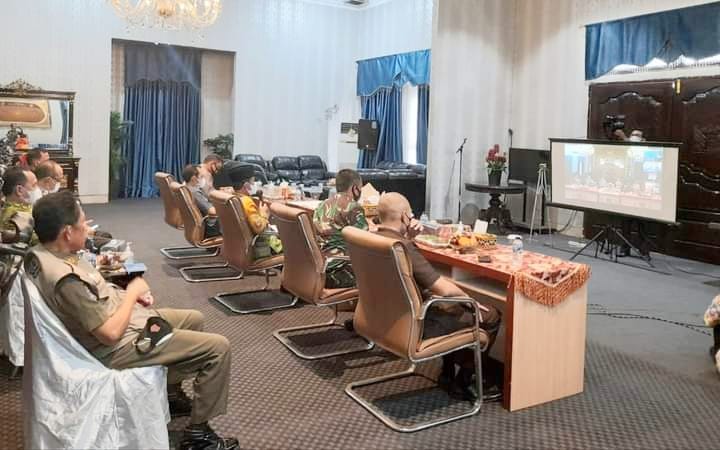 Lampung Utara, Nusantarapos – Bupati Lampung Utara (Lampura) Budi Utomo bersama Forkopimda melaksanakan Rapat Koordinasi Penanganan Covid-19 Secara Virtual bersama Camat, Lurah, Danramil Kapolsek, Kepala Desa, Babinsa, Babinkamtibmas dan Kepala Puskes se-Lampura di Rumah Jabatan Bupati setempat, Kamis (8/7/2021).