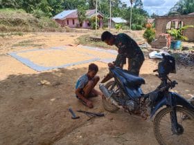 BENGKAYANG – Anggota Satgas TMMD Regtas ke-111 Kodim 1202/Singkawang yang bekerja di sasaran fisik tidak sengaja melihat motor warga yang rusak dengan kepedulian anggota Satgas TMMD ikut memperbaiki motor milik warga Desa Sentangau Jaya Jalan Trans Segorong Kecamatan Seluas Kab Bengkayang.