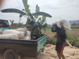 Nampak terlihat beberapa anggota satgas TMMD, Sabtu (10/07/2021) mengangkut hasil panen jagung dari ladang yang di panen menuju jalan TMMD di mana kendaran pick up.