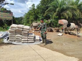 Bengkayang – Material untuk pendukung pembangunan jalan sepanjang 350 meter, anggota Satgas TMMD Ke 111 kodim 1202/skw di desa setangau jaya kec seluas kab bengkayang, Serda Andika menghitung ulang jumlah semen yang tiba di lokasi sehingga kebutuhannya dapat menyesuaikan.