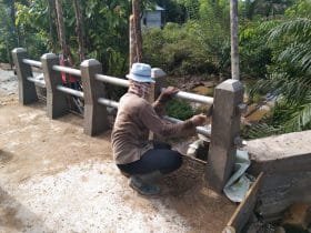 Bengkayang – Anggota Satgas TMMD Kodim 1202/skw di desa setangau jaya kec seluas kab bengkayang, Serda Sapriadi membersihkan sisa-sisa semen yang melengket di pagar jembatan.