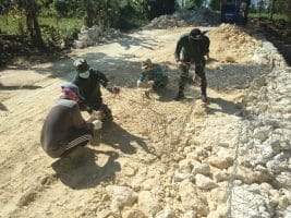 Satgas TMMD reg 111 Kodim Gresik bersama masyarakat bahu membahu bekerja dibawah terik sinar matahari, seperti yang dikatakan Serma Kiswiyanto yang tidak menggunakan baju lengan panjang saat bekerja, karena ingin berjemur sambil bekerja sehingga dapat meningkatkan imun dalam tubuhnya, Sabtu (10/07/2021).
