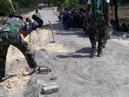 Satgas TNI Manunggal Membangun Desa (TMMD) Ke -111 Kodim 0817/ Gresik dibantu warga bekerja melaksanakan kegiatan dengan gotong royong.