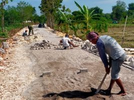 Gresik,- Terlihat begitu semangatnya anggota Satgas bekerja bersama sesuai pembagian tugas masing-masing, ada yang bagian operator mesin molen, ada yang bagian meratakan jalan, ada yang bagian mengantar adonan pengecoran, Minggu (11/7/2021).
