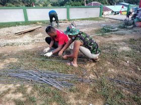 Bengkayang – Satgas Tentara Manunggal Membangun Desa (TMMD) Reguler Ke-111 Kodim 1202/skw di sentangau jaya kec seluas kab bengkayang, anggota satgas bahu membahu merangkai besi begel untuk pengerjaan perehaban pagar puskesmas pembantu.