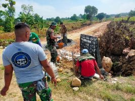 Terlihat Serma Iwan Wibowo, beserta dua rekannya yang sedang melaksanakan Pembuatan Prasasti TMMD, Yang terletak di pinggiran pembangunan beronjong.