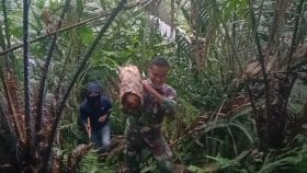 Satgas TMMD ke 111 kodim 0212/TS anggota Satgas membantu masyarakat mengambil kayu pohon pakis untuk di jadikan tempat pot bunga angrek di Desa Siuhom Kecamatan Angkola Barat Kabupaten Tapanuli Selatan.