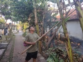 Meski dibawah terik panasnya sinar matahari, namun tidak menyurutkan niat, Serda Hendra anggota Satgas TMMD ke- 111, Kodim 0817/Gresik untuk membantu Kariyo membersihkan kebun pisang.