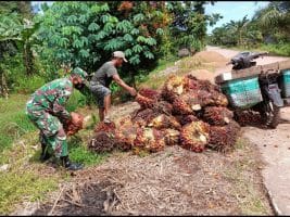 Kubu Raya -Banyak hal sederhana namun bernilai positif yang dilakukan oleh personil satgas TMMD ke-111 Kodim 1207/Pontianak di Dusun Maju Jaya, Desa Kuala Mandor B, Kecamatan Kuala Mandor B, yakni selalu sigap dan tanggap membantu warga yang membutuhkan bantuan. Tampak salah satu anggota satgas TMMD sedang membantu warga mengangkat tandan sawit yang berjatuhan, Rabu (30/06/2021),