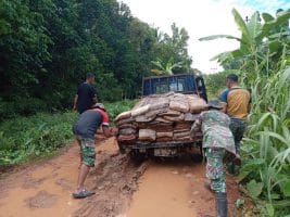 Mobil yang bermuatan karet yang akan dibawa ke pabrik terperosok karena jalannya becek dan berlobang, sehingga mobil pickup terperosok di jalan. Sopirnya mengatakan bahwa mobil yang dibawanya tiba-tiba ban belakang terperosok di jalan tanah yang becek dan berlumpur akibat tadi malam diguyur hujan. Melihat kondisi tidak memungkinkan,anggota satgas TMMD berserta masyarakat membantu mendorong mobilnya. Dengan bantuan anggota satgas TMMD dan masyarakat, mobil pickup yang berisi muatan karet berhasil ditarik dan didorong.