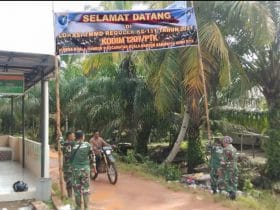 Tampak anggota Koramil 1207-06/Sungai Ambawang Kodim 1207/Pontianak sedang memasang banner tersebut di pintu masuk Gg. Parit Abak, Desa Kuala Mandor B, Kecamatan Kuala Mandor B.