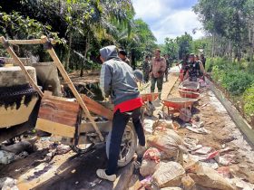 Kubu Raya – Suara gemuruh dari mesin molen seakan tidak mau berhenti dan memecah keheningan disetiap sudut Dusun Maju Jaya, Desa Kuala Mandor B, Kecamatan Kuala Mandor B, Kabupaten Kubu Raya, jarum jam menunjukkan pukul 13.00 wib, terlihat puluhan personil satgas TMMD ke-111 Kodim 1207/Pontianak dan masyarakat siap melanjutkan pengerjaan rabat beton jalan dusun, Selasa (22/06/2021).