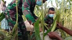 Satgas TMMD ke 111 Kodim 0212/TS anggota Satgas membantu warga di memanen jagung di Desa Siuhom Kecamatan Angkola Barat Kabupaten Tapanuli Selatan.