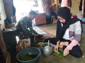 Dengan membantu membuat lontong diharapkan dapat membantu warga dan tersenyum, karena Serda Dika juga memberikan semangat kepada warga.(Pendim 1202/Skw)