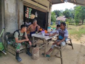 Bengkayang – Dalam pelaksanaan program TNI Manunggal Membangun Desa (TMMD) Ke-111 Kodim 1202/Skw menyelesaikan pekerjaan di sasaran Desa Sentangau Jaya, Kecamatan Seluas, tetap melaksanakan komunikasi sosial (Komsos) antara satgas TMMD bersama Pak Kadus.