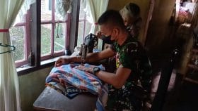 Satgas TMMD ke 111 Kodim 0212/TS belajar menjahit bersama masyarakat Desa Siuhom,, Kec Angkola Barat, Kab Tapanuli Selatan