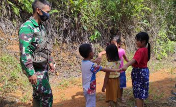 Bengkayang – Di sela-sela tugas TMMD ke-111 Kodim 1202/Skw, di Desa Sentangau Jaya, Kecamatan Seluas, Kabupaten Bengkayang, para anggota Satgas TMMD terus jalan kedekatan, dengan anak-anak di desa sasaran.
