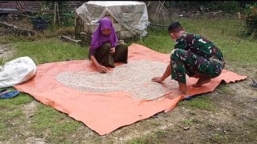 Bengkayang – Satgas TNI Manunggal Membangun Desa (TMMD) Regtas Ke 111 Kodim 1202/Skw di Desa Setangau jaya kec seluas kab bengkayang, membantu orang tua asuh menjemur sahang milik warga desa setangau jaya kec seluas kab bengkayang disela istirahat.